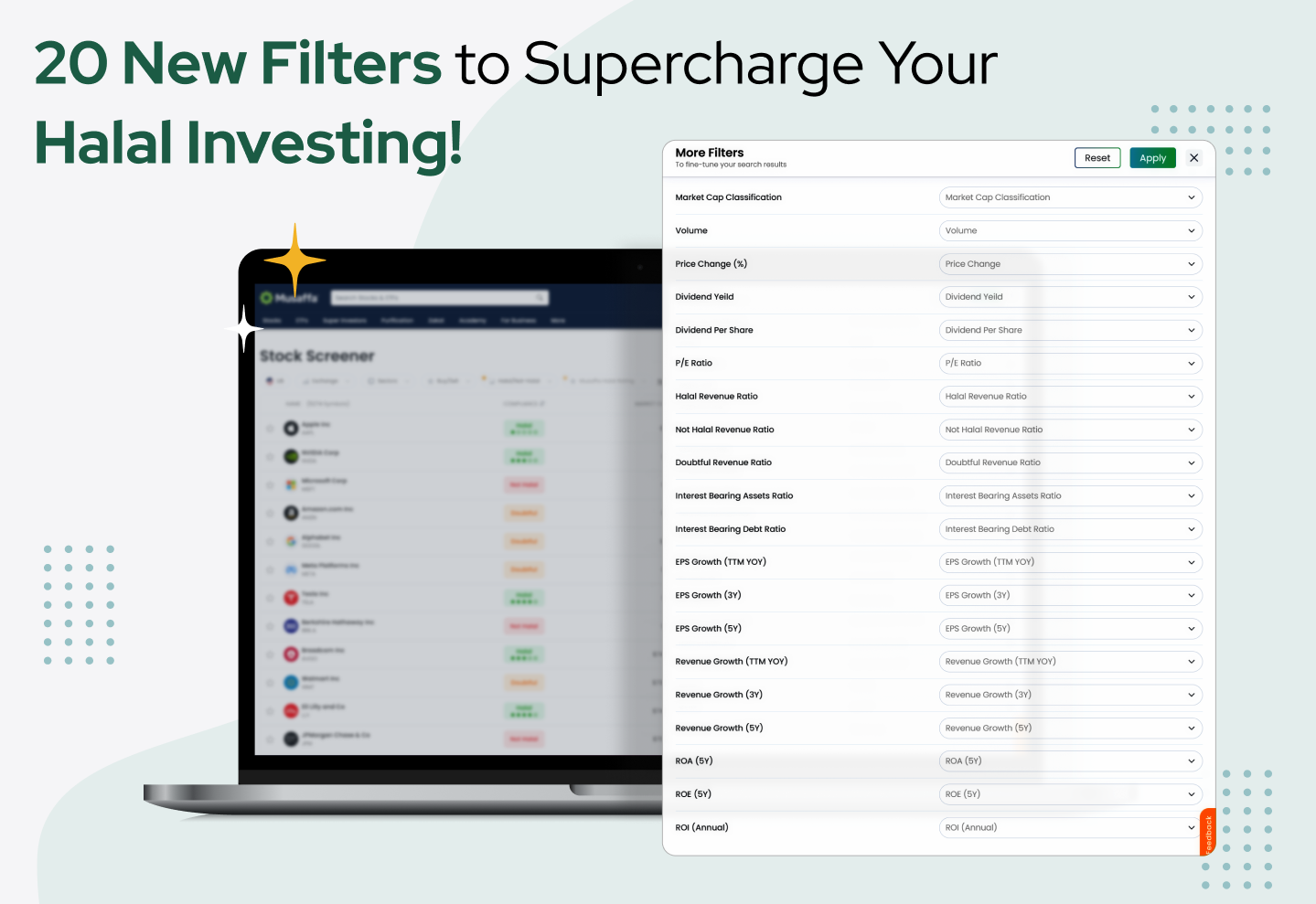 Introducing 20 new filters designed to help you discover the right Halal stocks for your portfolio. While compliance is key for Muslim investors, selecting great stocks is just as important to achieve your financial goals.