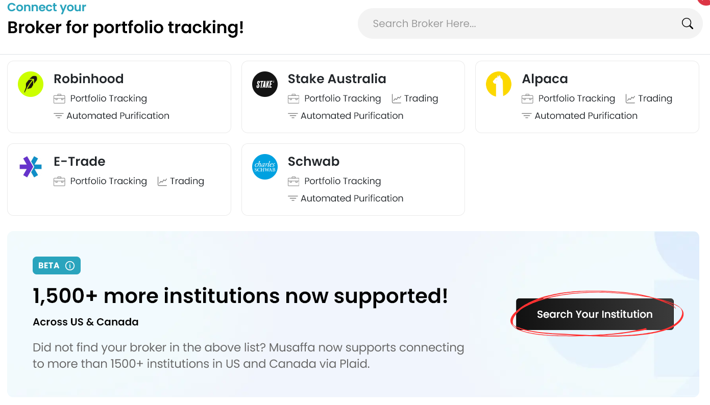 Search for your institution by typing its name, then follow the prompts to connect it to your Musaffa account.